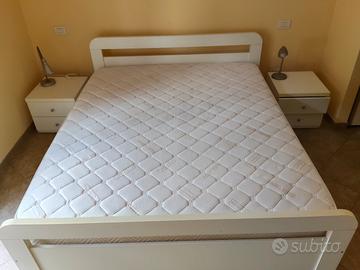 letto matrimoniale completo di rete e materasso a molle insacchettate, davvero comodissimo, rete con doghe in legno largo completo di due comodini, colore bianco. tenuti benissimo. già smontato, ritiro sul posto a carico dell'acquirente. prezzo leggermente trattabile.