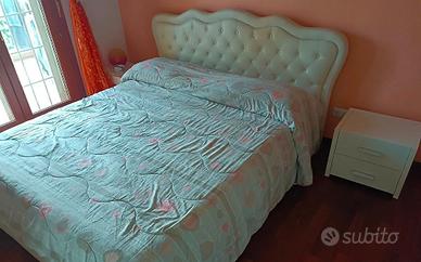 Letto matrimoniale con struttura rivestita in ecopelle di colore bianco.