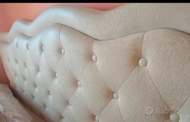 La testata presenta una lavorazione trapuntata stile capitonné con bottoni coordinati e profilo sagomato.