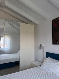 Letto matrimoniale IKEA 160x200 con cassetti contenitore laterali, in ottime condizioni, proveniente da stanza degli ospiti poco utilizzata. Cosa include: - Struttura letto IKEA in legno verniciato blu navy - Testiera alta abbinata - 2 cassetti contenitore laterali su ruote (ottima capienza per biancheria, coperte, stagionali, scarpe) - Rete a doghe in legno in perfette condizioni - Materasso matrimoniale 160x200 IN OMAGGIO (usato, igienizzato, in buono stato - ideale come soluzione immediata o per camera ospiti) Misure: - Larghezza: 160 cm - Lunghezza: 200 cm - Compatibile con qualsiasi materasso matrimoniale 160x200 Condizioni: Struttura integra, senza graffi o scheggiature rilevanti. Cassetti scorrevoli e funzionanti. Doghe tutte presenti e non danneggiate. Smontabile facilmente per il trasporto. Perche lo vendo: trasferimento in corso. Ritiro: Olbia (07026). Spedizione da concordare con l'acquirente su misura del corriere (volume ingombrante, consiglio ritiro in zona o province limitrofe). Aiuto con il carico. Disponibile videocall per mostrare il letto in ogni dettaglio prima dell'appuntamento. In omaggio cuscini e completo letto.