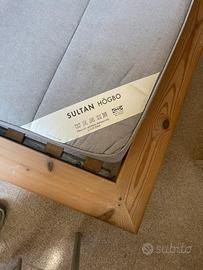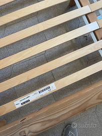 Struttura letto Ikea Hagali matrimoniale, legno massiccio, basso in stile futon, anni 90/2000. Smontabile. Reti a doghe Ikea Sultan Luröy (2 reti da 80x200 cm) in condizioni perfette, srotolabili. Materasso a due piazze Sultan Högbo, non sfoderabile, usato e quindi da pulire a vapore o simile. Condizioni buone, non perfetto ma ancora usabile, lo cedo perché devo cambiare destinazione alla stanza. Si trovano a Pavia, zona viale Partigiani, primo piano senza ascensore. SOLO RITIRO DI PERSONA, NON CONSEGNO. Prezzo eventualmente trattabile.