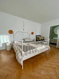 Vendo per cambio arredo letto matrimoniale IKEA LEIRVIK in metallo, cm. 160 x 200, colore bianco, stile romantico/vintage. Struttura solida e stabile, completo di doghe e barra centrale (supporto centrale). Condizioni ottime!