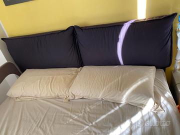 Letto matrimoniale tipo Natalie di Flou (testata composta da due cuscinoni morbidi) come nuovo con testata e giro letto imbottiti in cotone blu completo di rete a doghe in legno Misure 160 x 200