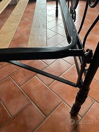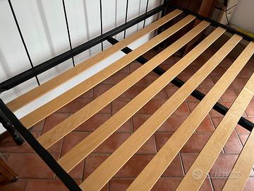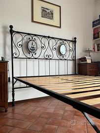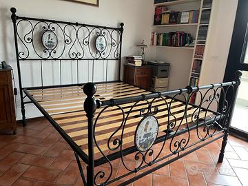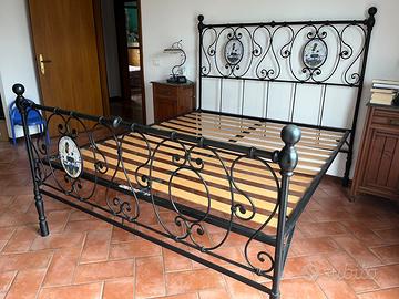 Si vende letto matrimoniale in ferro battuto nero. Il letto è originale del Novecento, con decorazioni in ceramica incomplete. Si vende testata e pediera completi di rete matrimoniale a doghe, materasso NON incluso. Altezza testata: 155 cm Altezza pediera: 103 cm Dimensioni rete: 190 cm x 160 cm Altezza rete da terra: 55 cm Usato ma in buone condizioni. Ritiro dei pezzi già smontati a carico dell’acquirente - PREZZO TRATTABILE