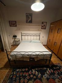 Vendo letto matrimoniale in ferro battuto, colore scuro con dettagli decorativi e pomelli in legno.