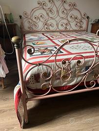 Letto matrimoniale in ferro battuto rosa e dorato, con rete