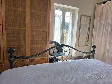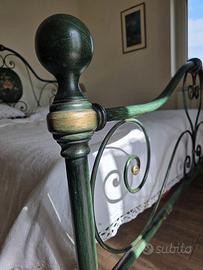 Bellissima struttura letto matrimoniale fine XIX secolo in ferro battuto con finitura verde decapè e dettagli in oro.