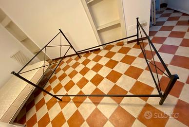 Vendo letto matrimoniale in ferro di colore nero. Come da foto si vende solo il contorno in ferro, senza doghe né materassi. Lunghezza 205 cm Larghezza 165 cm Può ospitare al suo interno: 2 materassi fino a 190x80cm o 1 materasso matrimoniale fino a 190x160cm Smontaggio e trasporto a carico dell'acquirente (lo smontaggio è molto semplice, trattandosi di 8 bulloni, posso anche eventualmente fornire aiuto)