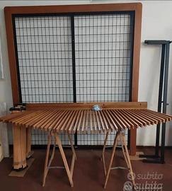 Vendo letto matrimoniale in legno (ditta EMMEBI, modello KABUKI) ...in legno e metallo con testiera a raggiera in legno noce nazionale chiaro... testiera in legno LA 190XH 75..struttura in legno e metallo 180x 210..base in metallo H 40 con due reti a doghe in legno 80x 200..letto Vintage anni'90.. già smontato... IN OMAGGIO letto singolo pieghevole con rete a doghe e materasso.. Ritiro a carico dell'acquirente