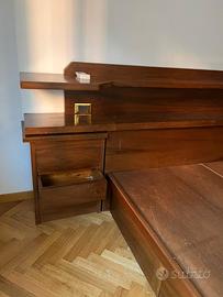 Vendo letto matrimoniale in legno massello, solido e in ottime condizioni strutturali, completo di testiera con mensole e due comodini integrati con cassetti. Ritiro e smontaggio a carico dell’acquirente.