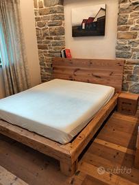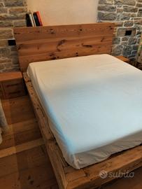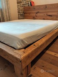 Letto matrimoniale con travi e testiera in legno rustico, fatto a mano, alta qualità