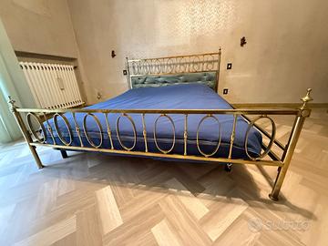 Struttura per letto matrimoniale in metallo decorato e testiera imbottita. Lo stato è buono ma la stoffa della testiera necessita di manutenzione /sostituzione