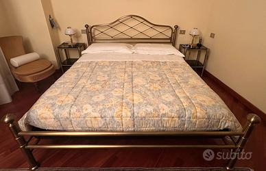 Vendo elegante struttura letto matrimoniale in ottone completa di rete a doghe in legno, dimensioni totali 210 cm di lunghezza e 170 cm di larghezza, adatta a materasso 170x200 cm, struttura solida e stabile con testata in ottone dal design classico ed elegante che dona carattere alla camera da letto, condizioni molto buone con normali segni d’uso, rete a doghe robusta e già inclusa nel prezzo, il letto viene venduto già smontato e pronto per il ritiro, materasso non incluso, ritiro a Milano, prezzo 700 € trattabili, contattami per ulteriori informazioni o per visionarlo.