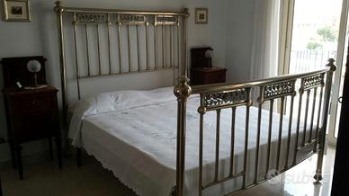 Letto matrimoniale primi Novecento in ottone cromato, con decori e disegni, completo di rete e materasso in ottimo stato. Smontaggio, ritiro e trasporto a carico del destinatario.