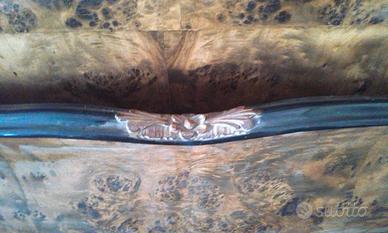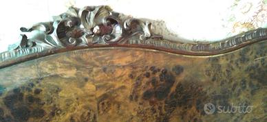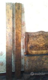 Letto matrimoniale in radica di noce d'epoca. Altezza massima testata 140 cm e minima anteriore bassa 80 cm, larghezza 180 cm circa. Le due traverse laterali misurano circa 190 cm e sono alte 15 cm con uno spessore di legno massello di 2,5 cm. Da pulire e lucidare in ottime condizioni.