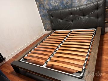 Letto matrimoniale king size con spalliera in vera pelle e legno massello con doghe ortopediche . Acquistato nel 2021 , nuovo . Misure : Spalliera 2.02 x 1.10 mt Doghe : 1.57x1.96 mt Ingombro letto : 2.42x1.86 mt Altezza 28 cm