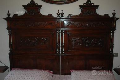Vendo letto matrimoniale in legno intarsiato fine '800, perfettamente restaurato, possibilità creare 2 letti singoli, misure 182x212cm, altezza sponda testata 187, altezza sponda pedata 100,con doghe artigianali, richiesta 2000 euro, contatti via email o al 349 2140173 signora Gemma.