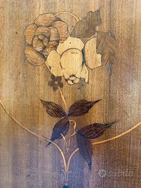 Letto matrimoniale originale di inizio ’900 in legno massello, stile Liberty, con eleganti intarsi floreali realizzati a mano. Linee armoniose e proporzioni importanti, tipiche dell’ebanisteria dell’epoca.