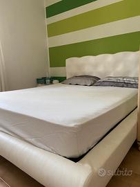 Vendo letto matrimoniale in buono stato,presenta soltanto una piccola scucitura (come da foto)sul piano coprirete,in ecopelle bianco misure totali larghezza 183x226 lunghezza altezza testata 97.