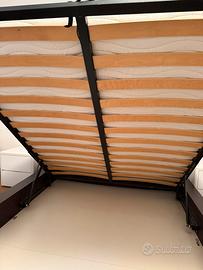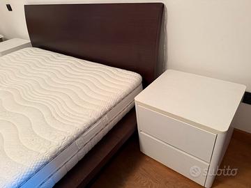 Vendo causa trasloco, anche separatamente con prezzi da concordare, letto con testata e struttura in legno, comprato da mobiliere, con doghe di legno color venge’ in perfette condizioni , materasso dorelan memory, e due comodini di legno bianco perfetti.