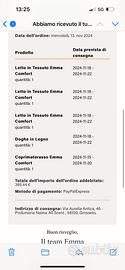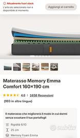 Letto matrimoniale completo di struttura e materasso memory Emma Comfort 160×190 cm". Nessun difetto, come nuovo. Il tutto è stato acquistato per: 400€ la struttura, e 400€ il materasso.