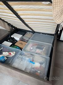 Il letto contenitore include una rete ortopedica a doghe con barra centrale di rinforzo e un pratico vano contenitore integrato nella struttura. Per accedere al contenitore, è sufficiente sollevare la rete utilizzando un meccanismo che riduce al minimo lo sforzo.