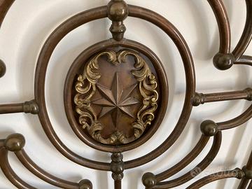 Nelle foto si vede la bellissima e imponente testiera montata e restaurata con le misure di 2 metri di larghezza e 1,58 cm di altezza massima. In più le pediere sono da restaurare con poca spesa e possono completare il letto nella sua completezza e imponenza .Oppure si possono usare per attrezzare un altro letto matrimoniale oppure ancora per altri due letti singoli