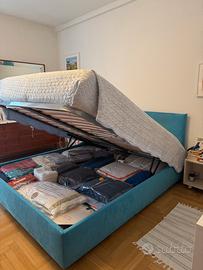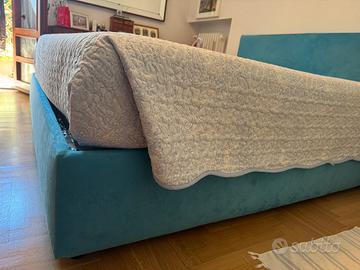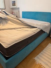 Letto matrimoniale acquistato nel 2021, colore ottanio, completamente sfoderabile, materasso 200 x 170 sfoderabile, molle insacchettate, copertura con un lato in lattice, no macchie, ottime condizioni, contenitore con ammortizzatori a gas, spazioso e foderato. Viene fornito smontato.