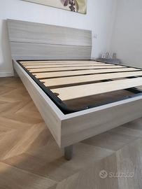 Vendo letto matrimoniale (cm 170x204x87) color olmo, dal design moderno, completo di rete con doghe larghe in legno e telaio in ferro.