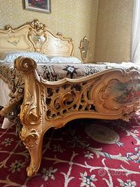 Spettacolare letto in legno massello, riccamente intagliato e dipinto, con volute S e C, conchiglie e dorature. Finitura avorio patinato con dettagli oro, testata e pediera sagomate. Produzione italiana, seconda metà ’900, in stile Silik: elegante, scenografico e pronto a rubare la scena in camera da letto