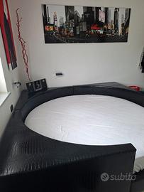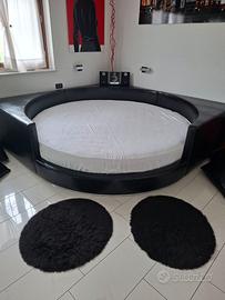 Splendido Letto Matrimoniale 2,44 metri per 2,44 metri. Materasso rotondo contenuto in struttura in ecopelle nera stampa coccodrillo. Come nuovo. Particolare. Regalo Tappeti neri rotondi e 2 copri-materasso. Compresi 5 maxi cuscini sempre in ecopelle nera stampa coccodrillo.