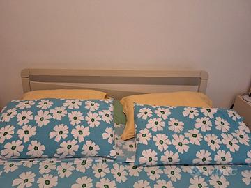 vendo letto matrimoniale con doghe in legno , completo di 2 materassi singoli. la testiera, come si vede dalla foto, deve essere sistemata rimettendo i pioli all'interno de buchi corrispondenti. smontaggio e trasporto a carico dell'acquirente .