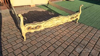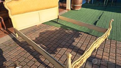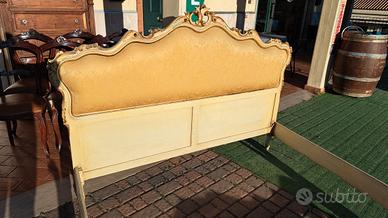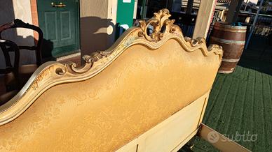 Letto anni 60 matrimoniale misura standard decorazione Veneziana oro avorio con decorazioni floreali. La testata è tappezzata in tessuto giallo oro in ottime condizioni...M&P Antichità siamo un negozio specializzato in antiquariato vintage e shabby vendita al dettaglio e all ingrosso scarichi settimanali oltre 500 articoli in negozio, abbiamo una vasta scelta di como comodini tolette armadi letti vetrine vetrinette credenze servanti angoliere librerie tavoli tavolinetti sedie poltrone poltroncine divani lampade lampadari tappeti scrivanie scrittoi secretere ribaltine consolle quadri cornici specchi cassapanche bauli oggettistica varia idee regalo e molto altro ci troviamo a Roma zona Castelverde via Massa San giuliano 26b POSSIBILITÀ DI CONSEGNA E SPEDIZIONE IN TUTTA ITALIA PER INFO LUCA