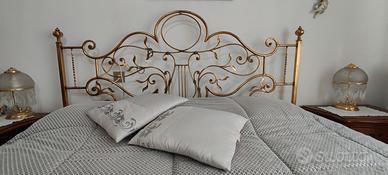 Letto matrimoniale in ferro battuto con particolari lavorati a mano, verniciato foglia oro. Completo di rete e materasso