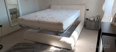 Letto matrimoniale con contenitore in ecopelle con rete a doghe . Meccanismo per alzare la rete perfettamente funzionante . Il letto di struttura è in ottime condizioni ma da rifare il rivestimento in ecopelle in quanto si sta rovinando. tutto sfoderabile. Testata letto con punti luce Swarovski. Materasso non incluso. Il letto si può assemblare e usarlo il rivestimento va messo alla fine tramite strappo.