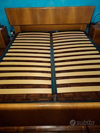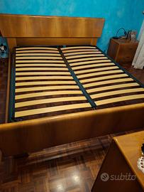 Struttura letto matrimoniale originale fine anni ’70 / inizi ’80, realizzata in vero legno di noce nazionale con finitura lucida e sagomatura elegante. Design vintage in stile classico, con testiera e pediera coordinate, in ottimo stato di conservazione.