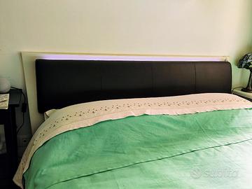 Letto moderno bianco avorio venato, con TESTIERA IMBOTTITA color MOKA in ecopelle e LED nella parte superiore che creano un'atmosfera calda e rilassante.