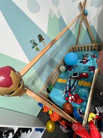 194.5 cm lungo da aggiungere 4 cm per la larghezza dei montanti della "tenda" 94cm largo 150cm di altezza. Materasso non incluso. Vendo per inutilizzo o per lo meno non usato come letto ma solo come poggia giochi e peluche.