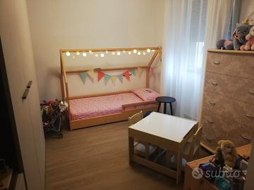 Lettino montessoriano in legno a forma di capanna, realizzato in legno naturale e con una struttura bassa pensata per permettere ai bambini di muoversi in autonomia. Dotato di sponda anticaduta, molto stabile, è un modello semplice, senza fronzoli, che si adatta bene a diversi stili di cameretta.