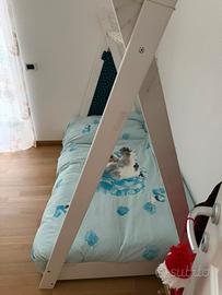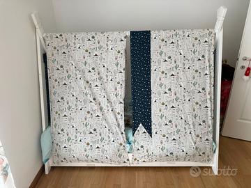 Letto in legno stile scandinavo nordico dimensioni 160x80cm colore bianco. In aggiunta stoffa su misura per trasformarlo in tenda. Si vende completo di materasso d piumone.