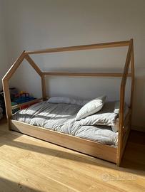 Letto montessoriano in legno a forma di casetta con barriere. Nella foto non è presente la barriera davanti in quanto l’avevo tolta per il bambino, ma comunque presente e montabile. Presenta piccoli graffi superficiali poco visibili.