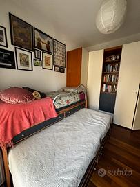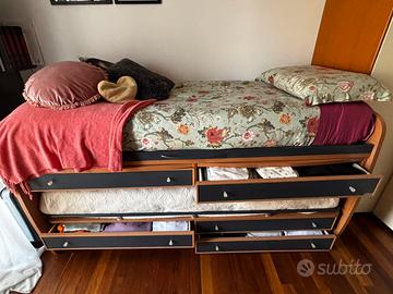 Letto multifunzione a due posti 90cm x 200cm con materassi, sei cassetti di 95cm x 50cm x 15cm, e due ripiani per scrivania da 90cm
