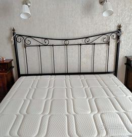 Letto contenitore con spalliera in ferro battuto marrone martellato . Bordò letto in tessuto lavabile colore beige. Letto fatto su misura completamente artigianale. Misure: altezza spalliera 135 cm. Larghezza 170 cm. Struttura letto larghezza 167 cm. Lunghezza 202cm. Senza materasso .