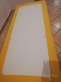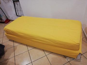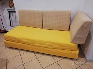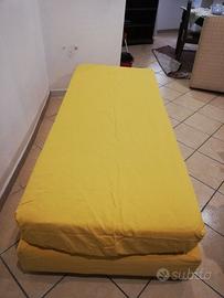Letto singolo trasformabile in divano perché ha 3 cuscini grandi sagomati come spalliera. Compreso materasso e la rete è un cassone fisso in legno con imbottitura bianca, il copriletto e scoprirete su misura di color giallo lo diamo compreso con il letto e si può togliere con bottoni automatici, completamente sfoderabile. È carino sia in giallo che in bianco. Vendo euro 95