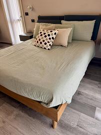 Letto in legno con pratico contenitore basso H18 con testiera tessile ottanio accessoriata con una coppia di pannelli regolabili. I particolari portanti del letto sono realizzati interamente in legno massello di frassino.