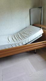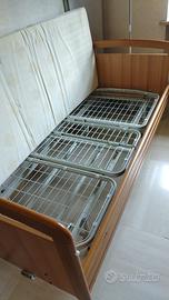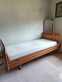 Vendo letto ortopedico manuale, con struttura solida in metallo e finiture in legno effetto faggio. La rete è articolata e suddivisa in tre sezioni regolabili tramite manovelle poste ai piedi del letto, che consentono il sollevamento