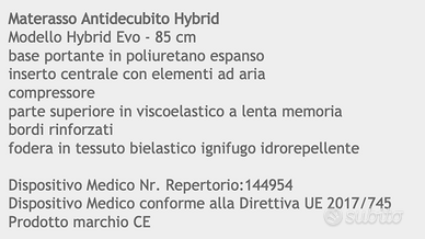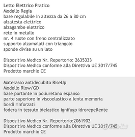 Letto ortopedico elettrico modello Pratico della Reamed, con sponde (una delle due è divisibile in due zone), presenti anche se non visibili nella foto. La scheda tecnica è presentata qui in foto. Il letto è stato utilizzato soltanto un mese ed è praticamente nuovo (acquistato a Gennaio 2026). Il primo materasso è stato poi sostituito da un materasso antidecubito con compressore, modello Hybrid, sempre Reamed (anche di questo allego la scheda). Questo materasso non è stato MAI utilizzato, ma solo montato nel Gennaio 2026. Il tutto acquistato direttamente da Reamed, per un costo di circa 4.300 (ho le fatture originali). Gli oggetti si trovano a Lesmo (primo piano senza ascensore). Ovviamente il trasporto non è semplice, ma in caso è possibile contattare il negozio Reamed di Concorezzo per il servizio (compreso il rimontaggio) ad un costo da saldare direttamente a loro.