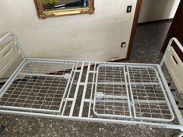 Letto ospedaliero con schienale e gambe regolabili grazie a 2 manovelle. Completo di rotelle, 2 sponde laterali, materasso antidecubito con fodera bianca impermeabile.Paria a nuovo