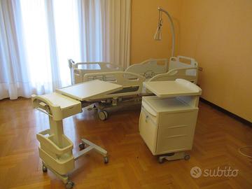 Letto Ospedaliero Trendelenburg elettrico marca Malvestio, completo di tutti gli optional: sponde a 4 settori con movimento a ribalta; 4 ruote diam. 150mm gemellate di cui una direzionabile e bloccabili contemporaneamente; Tavolino Servitore su ruote con regolazione a leggio e Vanity box cm 60/80x42x105h; Comodino con predisposizione all'alloggiamento del tavolino servitore cm 45x49x85,5h. Inoltre viene data anche l'asta sollevamalato laterale, direzionabile. Il tutto si presenta in ottimo stato come nuovo, in quanto è stato utilizzapo per pochissimo tempo. La richiesta per tutto è di €2200. Il trasporto è a carico dell'acquirente e può essere effettuato dalla ditta costruttrice per una cifra di circa €500.