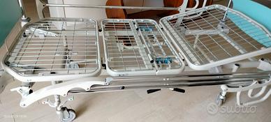 Letto ospedaliero con sponde laterali che si alzano e si abbassano. Due meccanismi di regolazione alza busto e alza gambe. Ruote bloccanti per spostare il letto.